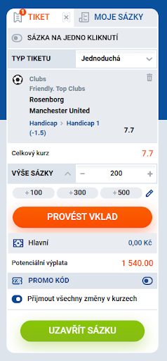 Jednoduchá sázka je základní typ sázky. Po výběru sportu přejděte na konkrétní událost nebo zápas, na který chcete vsadit. Kliknutím na zápas zobrazíte dostupné sázkové trhy. Vyberte si konkrétní typ sázky, například na vítěze zápasu, počet gólů nebo handicap, a klikněte na kurz, který odpovídá vašemu výběru. Tím se sázka přidá na tiket v pravé části obrazovky.